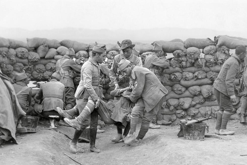Guerra del Rif, o guerra de Marruecos. Hacia 1920. Soldados españoles ayudando a un compañero herido.